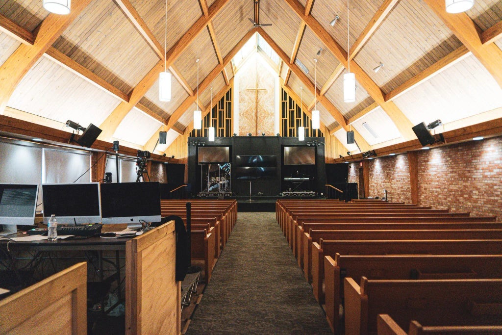 Sanctuary with built-in wood pews, high cathedral vault, skylights, scored tongue and groove knotty pine ceiling with wood laminated beams, casement crank-out windows, light fixtures, vinyl tile floor with carpet aisle, step up altar, brick walls, sacristy with wet bar and built-ins. Main entry and narthex with two entries, quarry tile floor and small chapel. Fireside room with carpet, paneled walls, zero clearance brick fireplace, breakroom with kitchenette. East wing with main level large community room and separate entrance, floating floor, drop ceiling. Partial third level as open teen center space and restroom and office, spackled ceiling and gable windows, painted walls, vinyl tile floors and painted drywall. Fluorescent lighting, radiators, hardwood custom staircases, painted block walls.