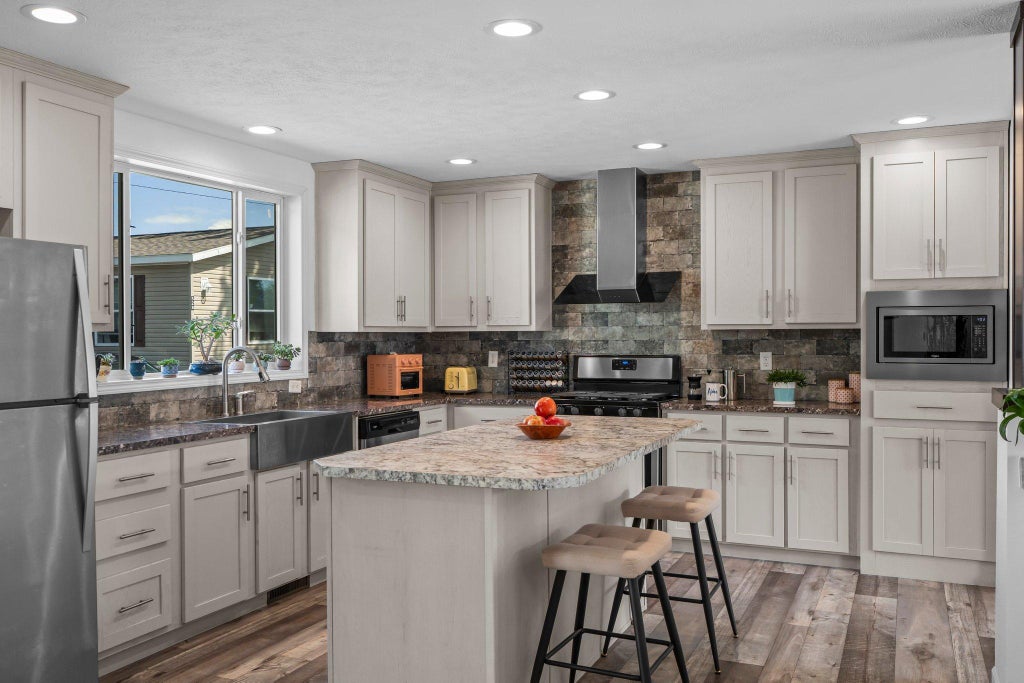 The living area flows seamlessly into a beautiful kitchen that will delight any home chef. Highlights include LVP flooring, stainless steel appliances, sleek countertops, a stylish tile backsplash, and a large center island with breakfast bar seating and built-in storage—ideal for casual meals or gathering with friends and family. The kitchen’s functional layout and bright ambiance make it both a practical workspace and a welcoming hub of the home.